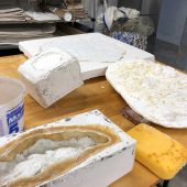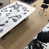 Sculptor Joan Hall works primarily with paper and print in her Rhode Island Studio where she has the capability to print up to five feet by ten feet and make paper up to eight feet by ten feet. She has been drawn to these processes throughout her career and they are the cornerstone to the work she produces and to the experimental techniques she has developed in papermaking and collagraph printing to produce her large-scale dimensional works.